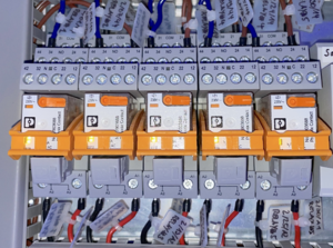 The control cabinet includes a set of relays. The sockets for skimmer and pumps of the aquarium itself are not powering the devices directly. Instead, the sockets are connected to the relays inside the control cabinet. The relays inside the cabinet control a set of power sockets inside the cabinet. Skimmer and pumps are powered from these internal sockets.